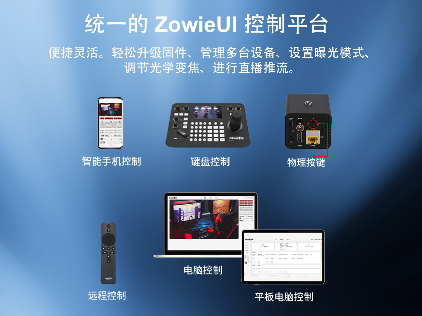 POV Zoom 提供多種直觀的控制方式,適配不同的制作流程。用戶可通過網(wǎng)頁瀏覽器訪問攝像機,或使用智能手機、平板電腦及電腦進(jìn)行遠(yuǎn)程配置。憑借對 RESTful API、ZowieUI 以及第三方控制器的支持,ZowieCAM 可實現(xiàn)無縫遠(yuǎn)程操作與精確的參數(shù)管理,為專業(yè)直播制作提供高效可靠的控制體驗。