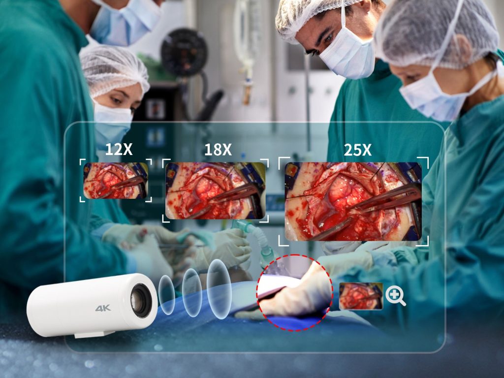 與傳統(tǒng)術(shù)野攝像機(jī)不同,MediCam 有 12 倍、18 倍或 25 倍三種高質(zhì)量光學(xué)變焦鏡頭可供選擇,以滿足不同手術(shù)場(chǎng)景的需要。此外,MediCam 還能以高倍率放大復(fù)雜手術(shù)過程的細(xì)節(jié)特寫。