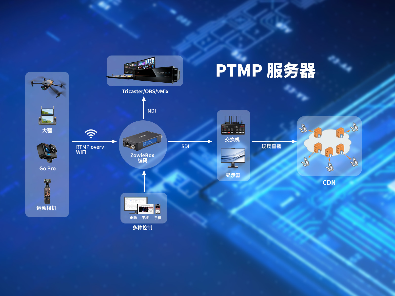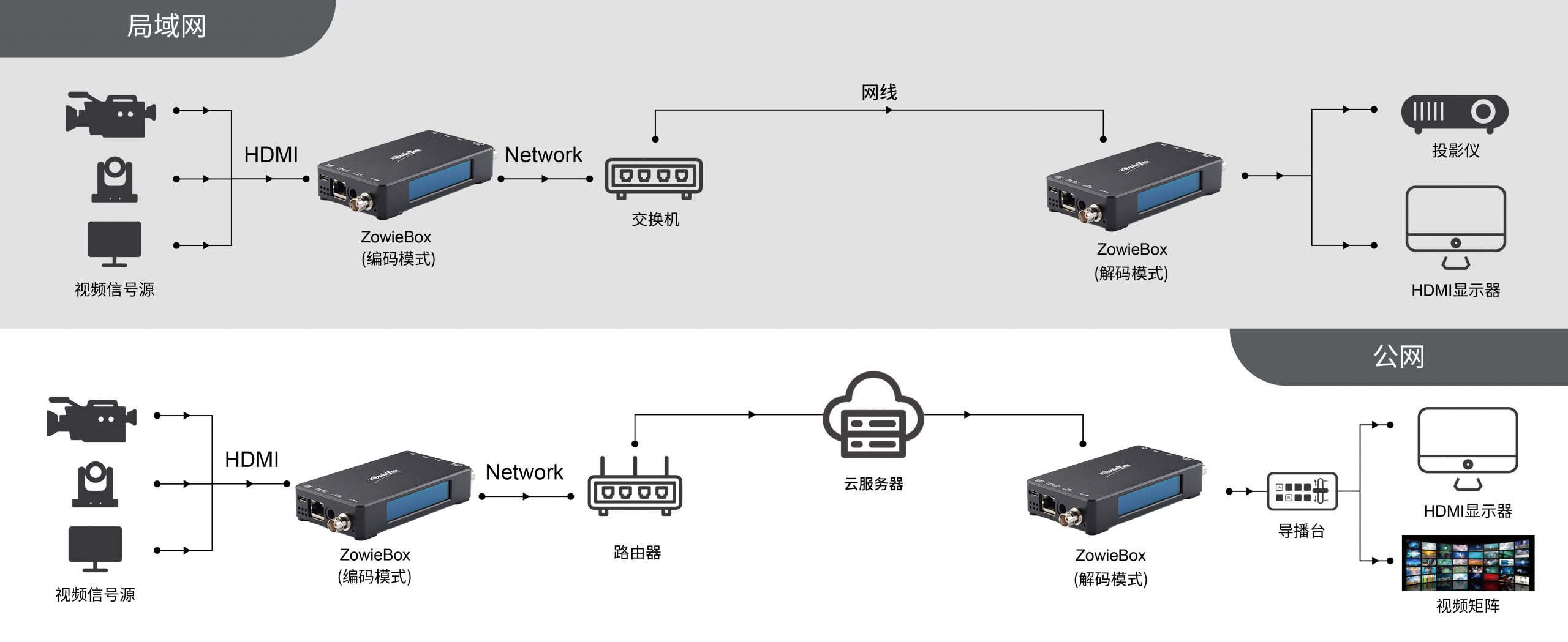通過 ZowieBox,來自計(jì)算機(jī)、攝像機(jī)等的任何視頻信號(hào)可以遠(yuǎn)程傳輸至遠(yuǎn)端,在局域網(wǎng)中的傳輸延遲僅為 100 毫秒;通過 SRT 或 RTMP 等協(xié)議,網(wǎng)絡(luò)可以支持遠(yuǎn)距離點(diǎn)對(duì)點(diǎn)的傳輸。